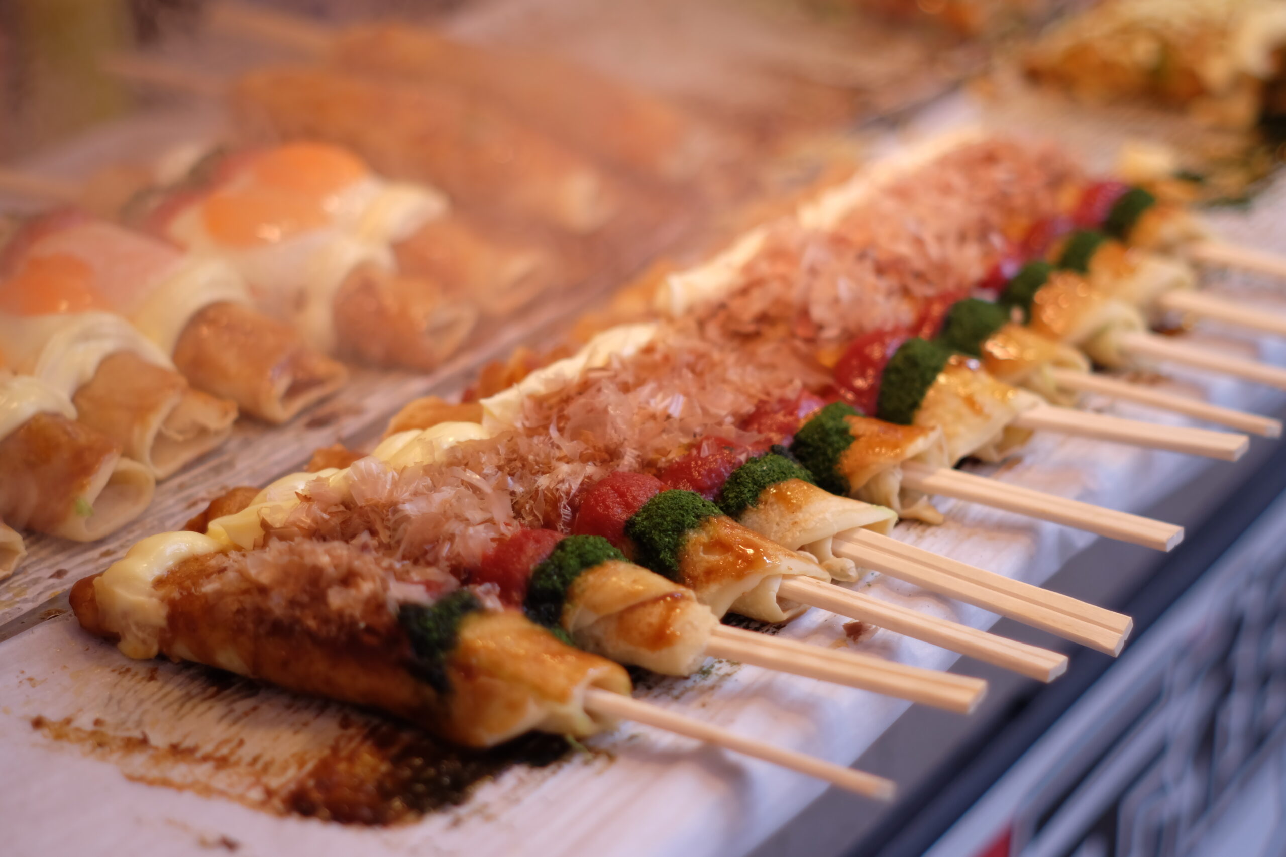 お好み焼を食べやすいように箸にくるっと巻いた形のお祭りの定番フードです。